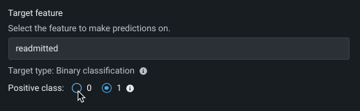 DataRobotでは、ターゲット特徴量に2つの一意の値(ブール値、カテゴリー値、または数値)がある場合に、二値分類エクスペリメントが作成されます。 この例には、顧客が期日までに決済するかどうか(YesまたはNo)、患者が再入院するかどうか(TrueまたはFalse)などがあります。 モデルは、特定の観測値が「ポジティブ」クラス(最後の例ではreadmitted=yes)に分類される予測確率を生成します。 デフォルトでは、予測確率が50%以上の場合、予測クラスは「ポジティブ」になります。代替のラジオボタンを選択して、Positiveクラスを変更し、 モデルのインサイトでPositiveとしてラベル付けできます。