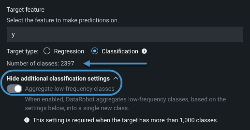 ターゲットタイプを変更すると、 多クラス設定オプションが有効になります。 ターゲットに1000を超える数値(クラス)がある場合、以下で説明する低頻度のクラスを集計オプションがデフォルトで有効になります。