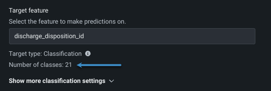 分類エクスペリメントの設定は、タイプ(クラス数)に依存し、ターゲット特徴量エントリーの下にターゲットタイプとしてレポートされます。二値分類またはターゲットタイプ:分類。この場合、クラスの数も報告されます。