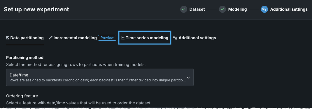 設定は、データパーティショニングタブ(順序付け特徴量とバックテスト)から継承されます。 必要に応じて、参照して完了します。