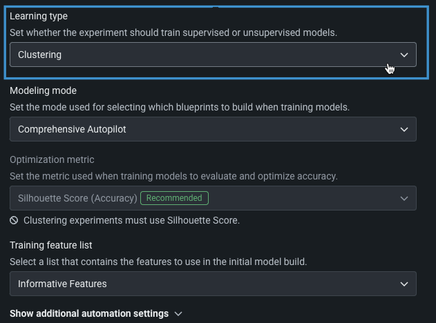 クラスタリングのエクスペリメントを設定するには、学習タイプをクラスタリングに設定します。 教師なしエクスペリメントではターゲットを指定しないため、ターゲット特徴量フィールドは削除され、他の基本設定が利用可能になります。