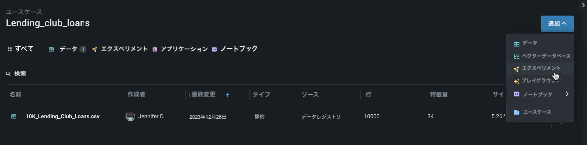 ユースケース内から追加をクリックし、エクスペリメントを選択します。 新しいエクスペリメントの設定ページが開き、ユースケースにロード済みのすべてのデータが一覧表示されます。
