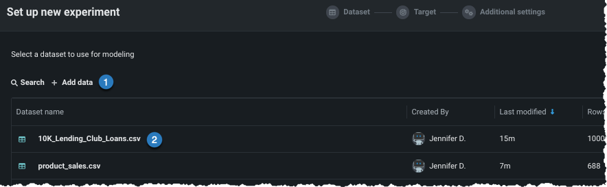 新しいデータを追加 する(1)か、ユースケースに既にロードされているデータセットを選択する(2)ことにより、エクスペリメントにデータを追加します。