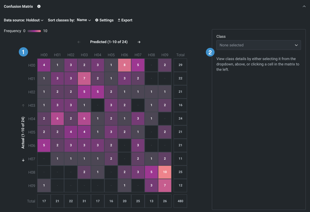 選択したクラス行列を使用して、特定のクラスを分析します。 クラスを選択するには、行列全体をクリックするか、またはドロップダウンから選択します。 ドロップダウンから選択すると、多クラス行列のハイライトが更新され、現在の個々の選択にフォーカスします。 多クラス行列の軸を変更すると、選択したクラスの混同行列のレイアウトが変更されます。