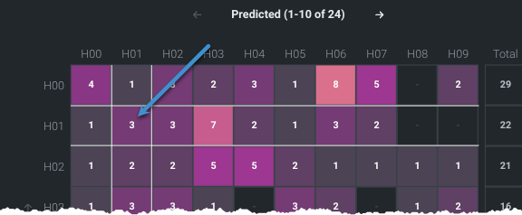 多クラスマトリックスであるヒートマップは、DataRobotが選択したターゲットに対して認識したすべてのクラス(値)の10セルごとの10セルの概要を、出現頻度ごとに色分けして提供します。 行列表示を操作するための一部のツールには、マルチオプションツールバー (1)、ページスクロール (2)、および2つの合計列 (3) があり、トレーニングセット全体のコンテキストで選択したページを理解し、データセット全体のクラスの保有率を理解するのに役立ちます。