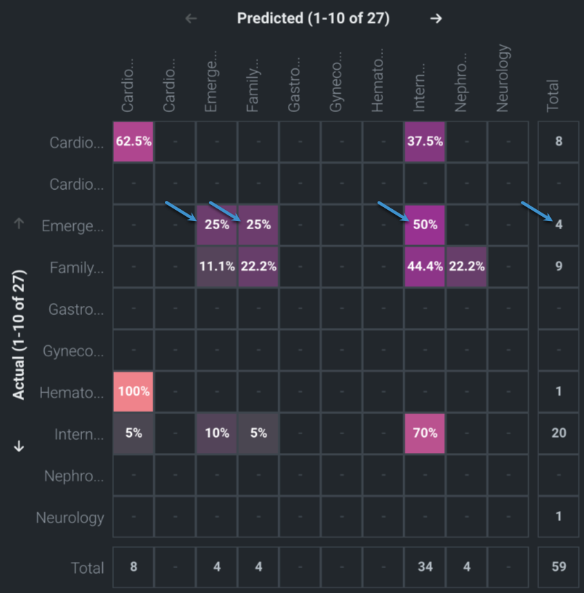 カウントで表示する場合、色は表示されているセルでの最大値に基づきます。 つまり、最も一般的なクラスが、まれなクラスよりも優位になります。 最初のスクリーンショットでは、InternalMedicineは実測値と予測値の両方で最も一般的なクラスであるため、最も明るいセルが割り当てられます。 Predicted InternalMedicine vs Actual InternalMedicineが最も明るく、14回出現します。