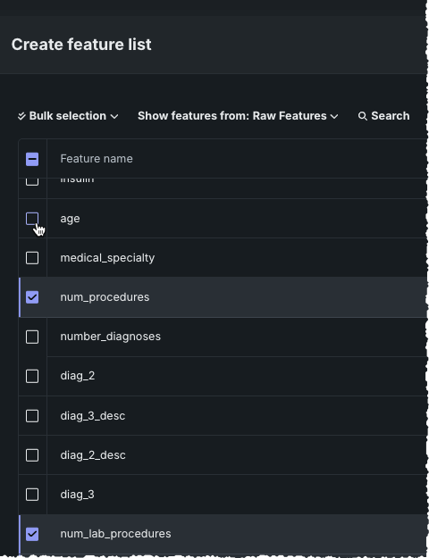 新しいセットの特徴量を選択モーダルで、新しいセットに含める特徴量の数を選択し、次へをクリックします。 表示された画面から、 カスタム特徴量セットのリファレンスで説明されているように、特徴量を個別に選択したり、一括アクションを使用したりすることができます。