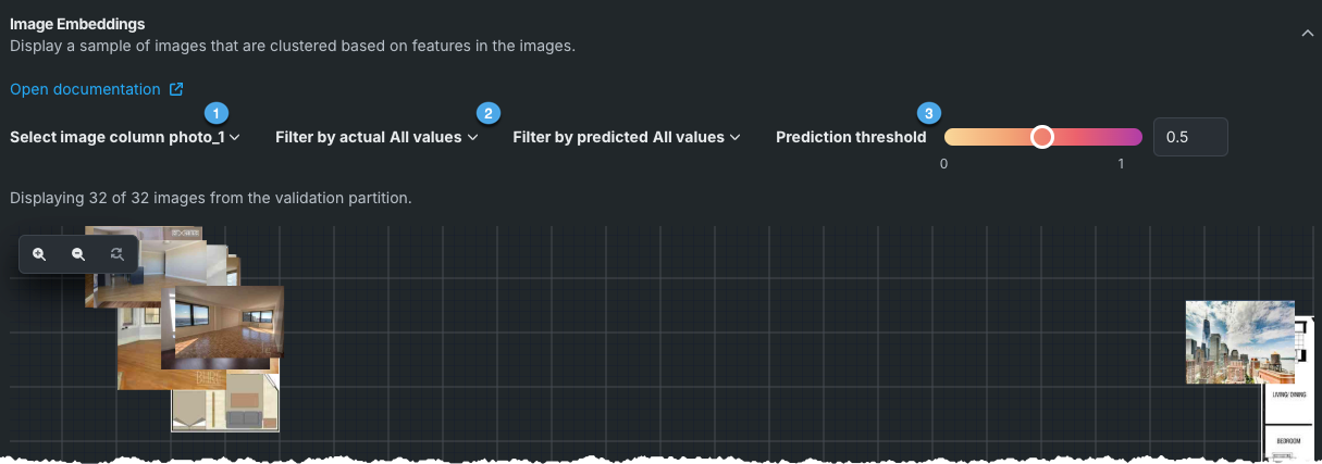 画像埋め込みキャンバスでは、画像の投影を2次元で表示するため、画像グループ間の類似性を視覚化し、外れ値を特定するのに役立ちます。 コントロールを使用すれば、画像をより詳細に表示できます。 次のコントロールを使用できます。