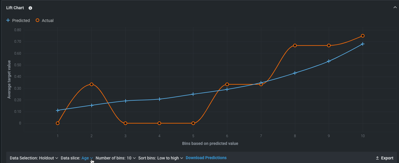 NextGen UIに関するドキュメント > AIエクスペリメント > モデルインサイトでの評価 > リフトチャート リフトチャート¶ タブ 説明 パフォーマンス モデルがターゲット母集団をどの程度適切にセグメント化しているか、またターゲット特徴量の値のさまざまな範囲に対して、モデルのパフォーマンスがどの程度良好であるかを示します。 任意のポイントにカーソルを合わせると、そのビンの行の予測値スコアと実測値スコアが表示されます。 表示条件を変更するにはコントロールを使用します