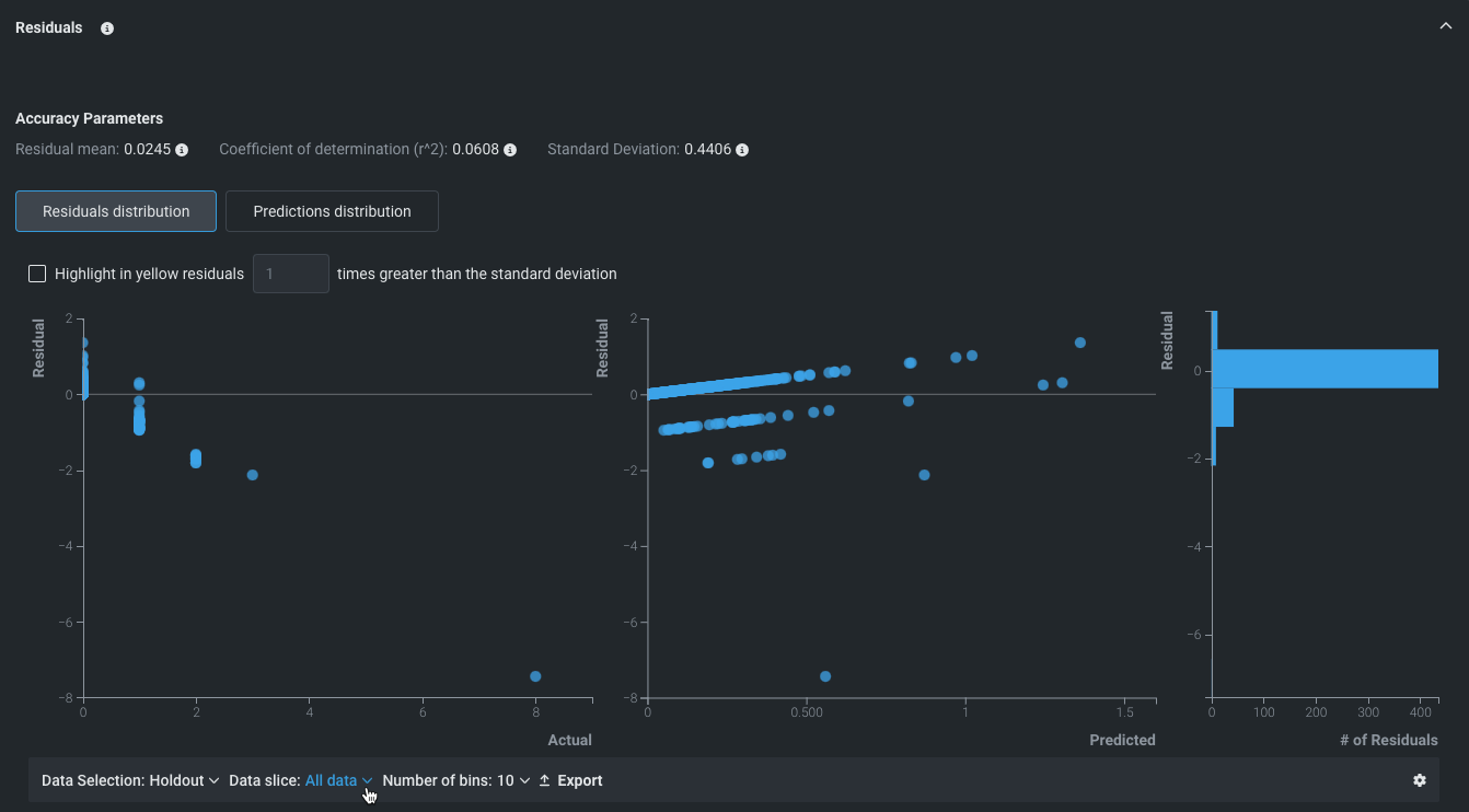 NextGen UIに関するドキュメント > AIエクスペリメント > モデルインサイトでの評価 > 残差 残差¶ タブ 説明 パフォーマンス モデルの予測パフォーマンスと妥当性を理解するのに役立ちます。 連続値エクスペリメントの場合、残差を使用すれば、データセットの実測値に対して、モデルがどの程度線形にスケールするかを測定できます。 これには、残差分析に役立つ複数の散布図および1つのヒストグラムが表示されます。 予測値と実測値の比較 残差と実測値の比較 残差と予測値の比較 残差ヒストグラム