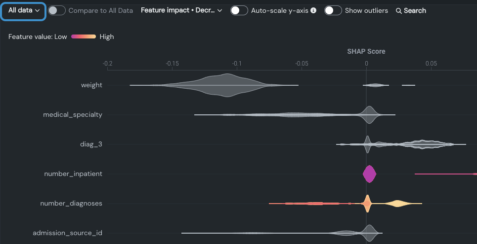 表示される各バイオリンプロットは、最大1,000行のSHAP値に基づいています。 データセット全体またはデータセットのスライスされたサブセットのいずれかに1,000行未満の行しかない場合、バイオリンプロットはそれより少なくなります。 各特徴量について、DataRobotは1,000のデータポイントを均一なビンに分割します。 一般的に、分布を表す形状を比較するのにインサイトを使用します。 バイオリンプロットがクラスター(コホート)なのか、それとも一様なのかを評価することで、特徴量が強く影響する値のグループを持つのか、正の影響を与えるのか、またはほとんど影響しないのかを判断できます。