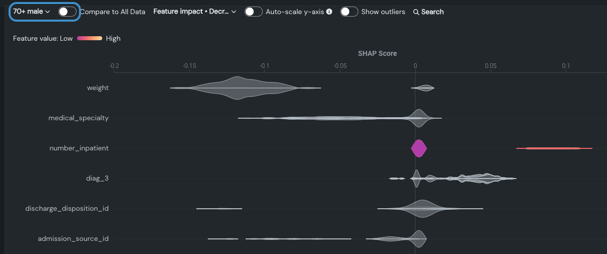 | すべてのデータと比較 | 部分母集団(スライス)に対する特徴量のインパクトを表示します。 結果は、完全な母集団を考慮した場合の影響と重ねて表示されます。 | 予測 |