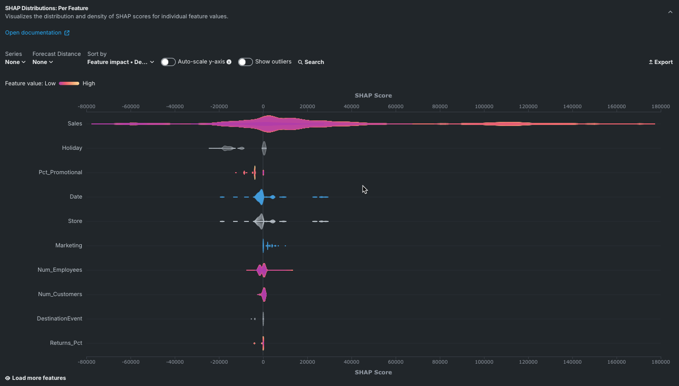 SHAP分布:特徴量ごとは、バイオリン図とも呼ばれ、さまざまなカテゴリー間でデータセットの確率分布を比較するための統計図です。 データの滑らかで連続的な形状を示します。 縦軸はデータセットの特徴量を表し、横軸はSHAPスコアを表します。 その結果、プロットされた密度形状は、異なる値におけるデータの最大1,000行のサンプリングに基づく分布を表しています。 ある値における「バイオリン」の幅は、その値の周辺にどれだけのデータ点が集まっているか、ピークがあるか、均等に広がっているかを示しています。 分布の具体例を参照してください。