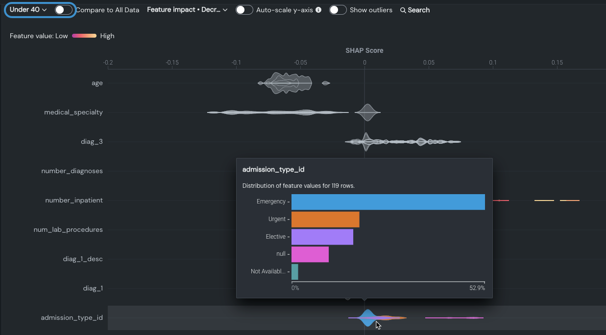離散特徴量(フルプロットではグレー)にカーソルを合わせると、完全な分布の上位7クラスまでが表示されます。 他のすべての画像はグレーで表示されます。 たとえば、40歳未満の患者のadmission_type_idを見ると、emergencyの値は結果にほとんど影響を与えていないように見えますが、urgentは予測結果により強く影響していることがわかります。