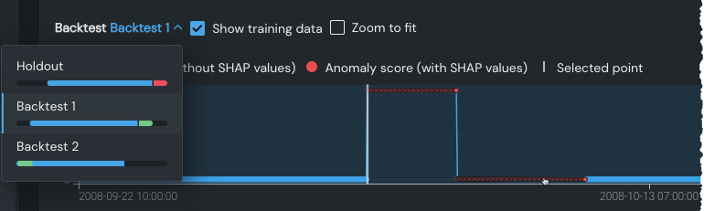 ドロップダウンを使用して、特定のバックテストまたはホールドアウトパーティションを選択します。 チャートが更新され、その日付範囲内のデータのみが含まれます。 複数系列プロジェクトの場合は、追加のドロップダウンを使用して目的の系列を選択できます。