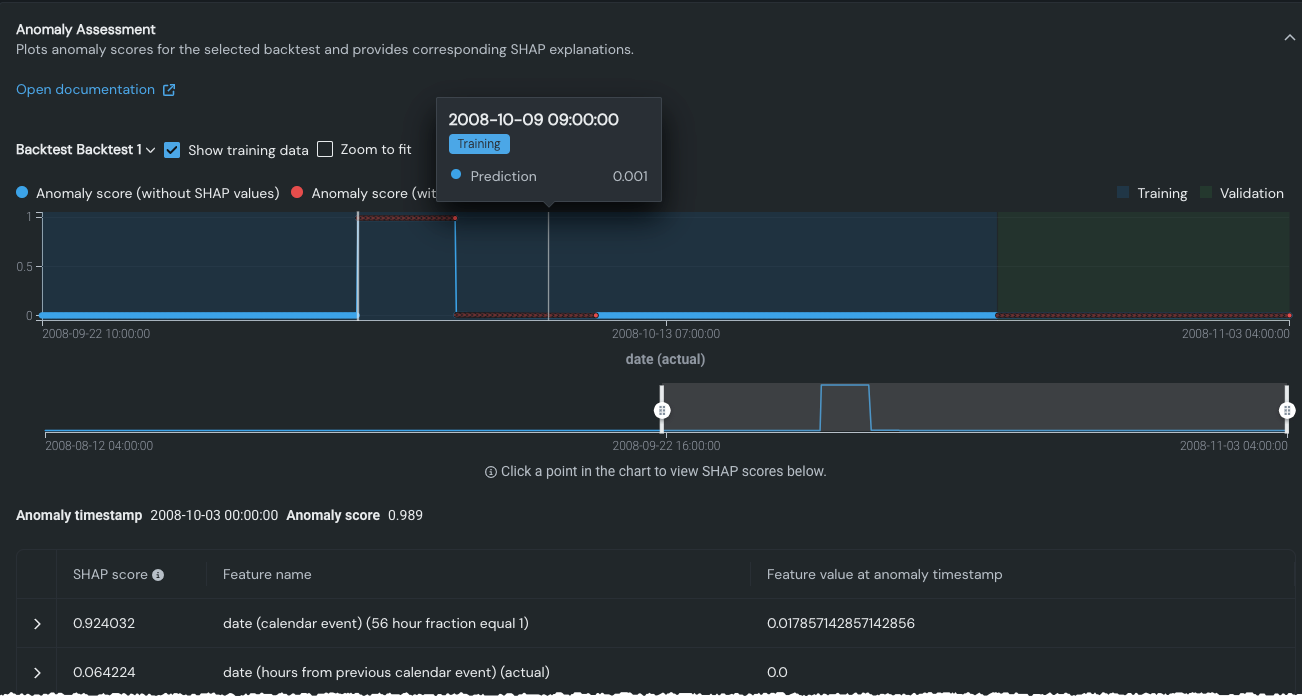 | パフォーマンス | 選択したバックテストのデータがプロットされ、最大500の異常ポイントのSHAPの説明が表示されます。 |