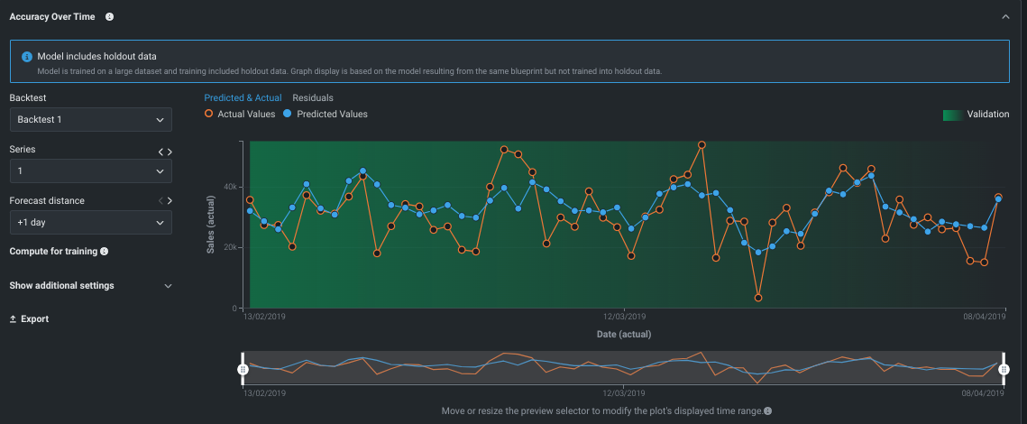 時系列の精度では、デフォルトでは、直近(最初)のバックテストのトレーニングデータおよび検証データにおける予測値と実測値を時間軸に沿って表示します。 これは、予測のデプロイと作成に使用されるバックテストモデルです。 (つまり、検定セットの誤差指標の生成に使用するモデルです。) 時系列エクスペリメントの場合、表示で使用する系列(該当する場合)および予測距離を制御できます。 系列ベースのエクスペリメントは、計画されたスペースとメモリー要件に応じて、 オンデマンドで計算されることがあることに注意してください。