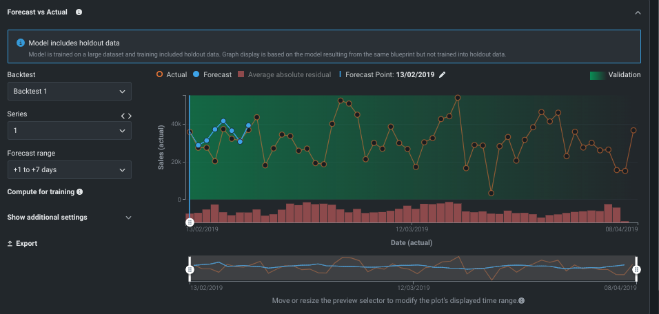予測と実際の比較は、ニーズに対して最適な予測距離を知るのに役立ちます。 1日だけの予測で最良の結果が得られる場合がありますが、ビジネスにとって最も実用的なものではない場合があります。 ただし、今後3日間の予測は比較的精度が高く、提供された情報に対応する時間が生まれる可能性があります。 エクスペリメントにカレンダーデータが含まれている場合、これらのイベントはこのグラフに表示されるのでイベントの影響に関するインサイトを取得できます。 系列ベースのエクスペリメントは、計画されたスペースとメモリー要件に応じて、 オンデマンドで計算されることがあることに注意してください。