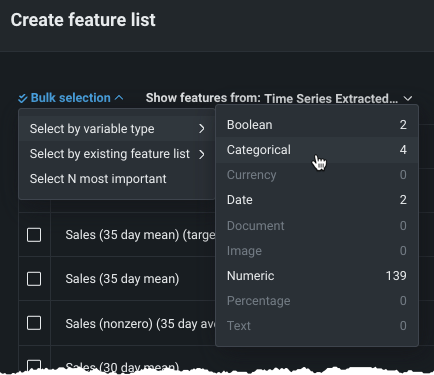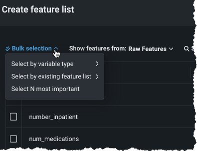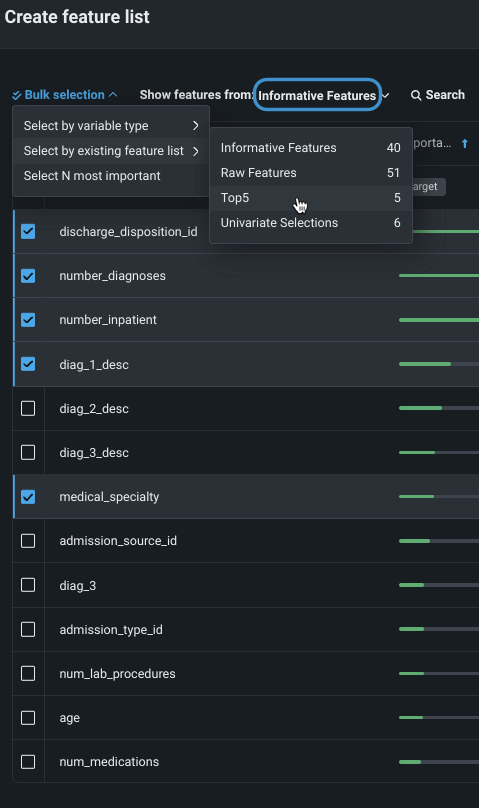 一括アクションは、特徴量の表示元:ドロップダウンの補助的なものであることに注意してください。 たとえば、"Top5"リストから特徴量を表示すると、カスタムリストに追加された5つの特徴量が表示されます。 次に、既存の特徴量セットで選択 > 有用な特徴量(または時系列の有用な特徴量)を使用すると、「有用な特徴量」にも含まれる「上位5」内のすべての特徴量が選択されます。 逆に、特徴量を表示:有用な特徴量に設定し、既存の特徴量セットから選択 > 上位4を選択すると、それら5つの特徴量が選択されます。