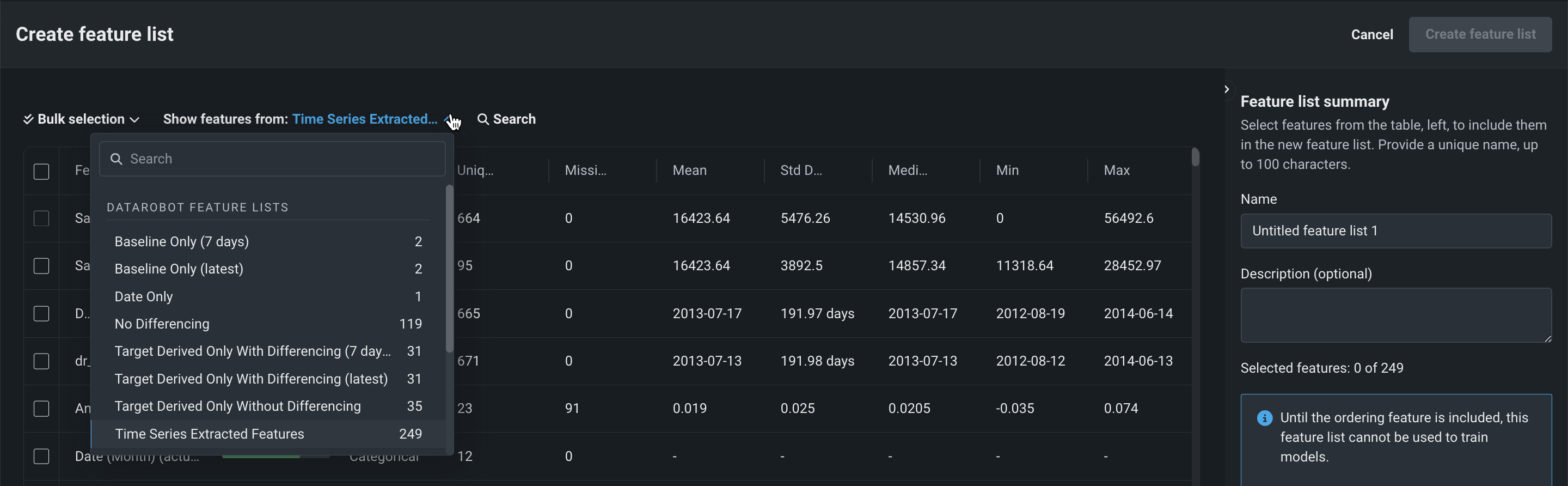 特徴量の表示元:ドロップダウンを使用して、選択可能な表示済み特徴量を変更します。 デフォルトでは、時系列で抽出された特徴量セットから特徴量をリスト表示します。 すべての自動生成されたカスタムリストは、ドロップダウンから使用できます。