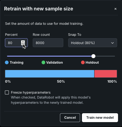 サンプルサイズを変更するには、報告されたサンプルサイズの横にあるアイコンをクリックし、表示されたモーダルで新しい値を入力します。 新しいサンプルサイズを特定のポイント(データセットのサイズによって決定)を超えて設定すると、フローズン実行が強制されることに注意してください。 フローズン実行なしで大きいデータセットのサンプルサイズを増やすには、 ブループリントリポジトリから新しいモデルを作成します。 フローズン実行を手動で強制することもできます。