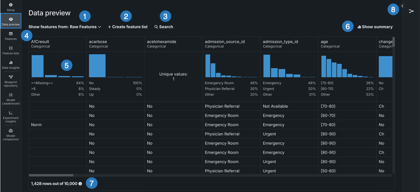 データ品質評価には、データプレビューまたは特徴量タイルのサマリーを表示(まだ開いていない場合、ボタンにはサマリーを表示しないと表示されます)をクリックすることでアクセスできます。