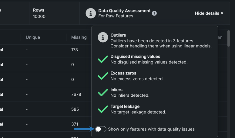結果は特徴量セットに基づいているため、選択された特徴量セットを変更すると、新しいチェックが表示されたり、現在のチェックが評価から消えたりする可能性があります。 たとえば、特徴量セットList 1に外れ値を含む特徴量problemが含まれる場合、評価には外れ値チェックが表示されます。 セットをproblem(または外れ値を持つ他の特徴量)が含まれないList 2に変更すると、外れ値チェックで「問題なし」 と報告されます。