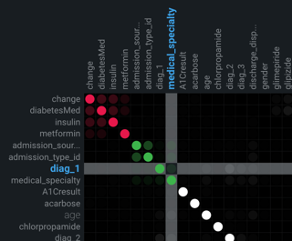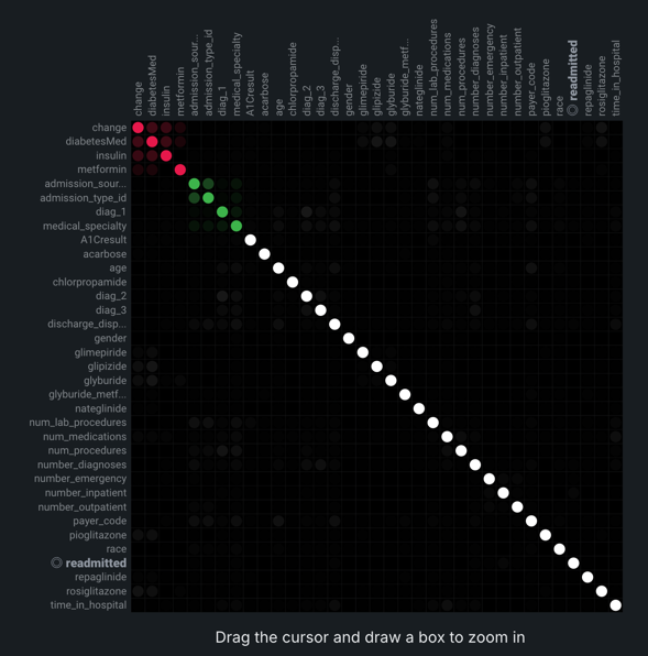 - 色の不透明度は、特徴量ペアの間における0~1の同時生起(関連または依存)を示します。 レベルは、相互情報量またはクラメールのVのいずれかの設定指標によって測定されます。
