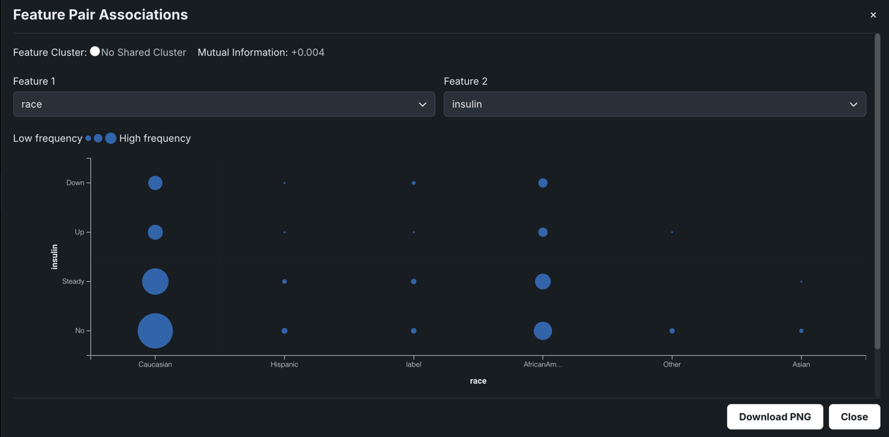特徴量クラスタータブからアクセスしても、特徴量の関連性タブからアクセスしても、インサイトは同じです。 表示されたインサイトは、PNGをダウンロードをクリックして保存できます。