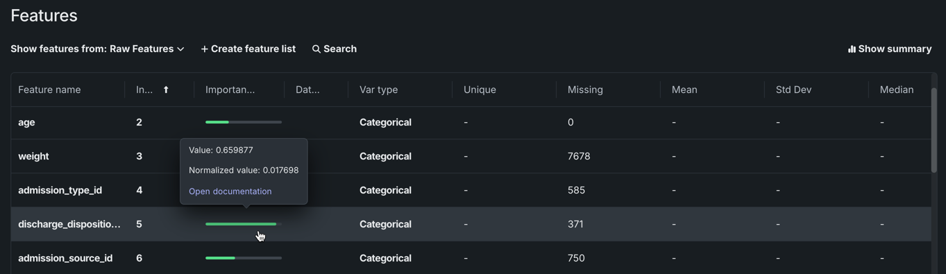 特徴量は、最も有用性の高いものから低い順にランク付けされています。 各特徴量の横にある緑色のバーの長さは、その相対的な有用性を示しています。—バーの全長と比較したバーの緑色の量は、潜在的な特徴量の最大の有用性を示しています(Normalized Valueに比例しています)。—バーの緑色が強いほど、その特徴量がより高い有用性であることを示しています。 緑色のバーの上にマウスを置くと両方のスコアが表示されます。 これらの数値は、その特徴量だけを使用するモデルのプロジェクト指標(プロジェクトが実行されたときに選択された指標)に関するスコアを表しています。 リーダーボードで指標を変更してもツールチップに表示されるスコアには影響しません。