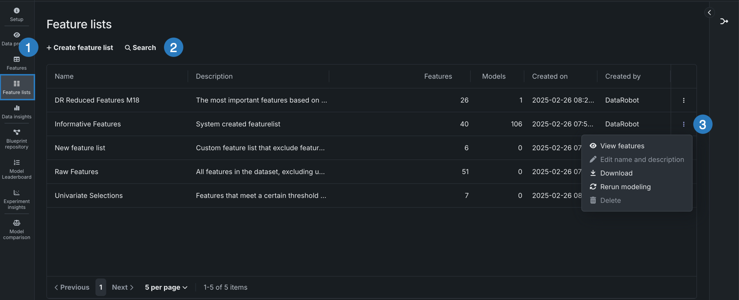カスタム特徴量セットは、モデリング前にデータエクスプローラーから、またはモデリング後にデータプレビュー、特徴量、またはこのタイルから作成できます。 新規リストの作成については、 カスタム特徴量セットのリファレンスを参照してください。