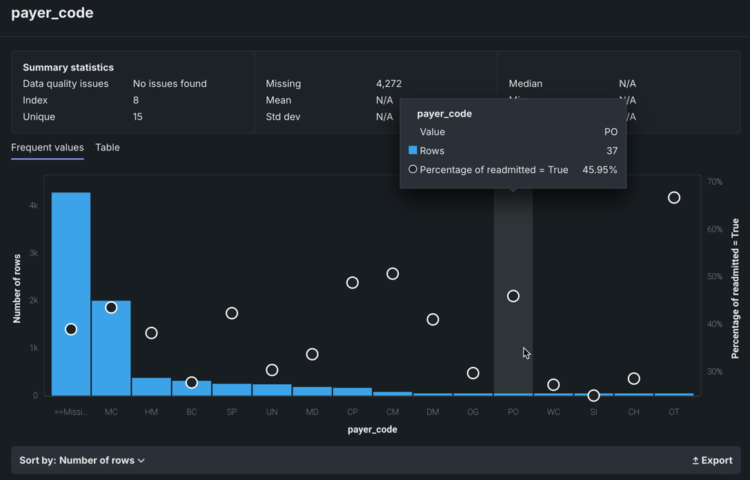 多くの場合、ソート順ドロップダウンで表示を変更できます。 デフォルトでは、頻度(行数)で降順にソートされます。 また、<feature_name>で並べ替えることもできます。この場合は、アルファベット順、または数値の場合は小さい順に表示されます。 エクスポートリンクを使用すると、頻出値チャートの画像をPNGファイルとしてダウンロードできます。
