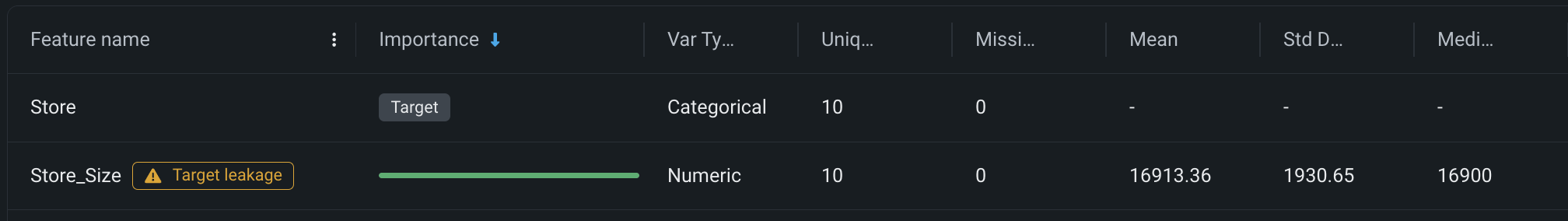 EDA2の計算時に、DataRobotはターゲットリーケージをチェックします。ターゲットリーケージは、予測時にその値を知ることができない特徴量を指し、過度に楽観的なモデルにつながります。 これらの特徴量の横にはバッジが表示されるため、簡単に識別して新しい特徴量セットから除外できます。