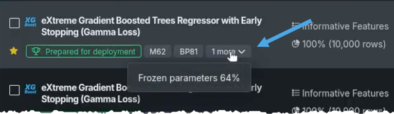 クイックモードを実行した場合、ワークベンチでサンプルサイズフェーズが64%完了すると、最も精度の高いモデルが選択され、100%のデータでトレーニングされます。 そのモデルには、デプロイの準備済みバッジが付けられます。