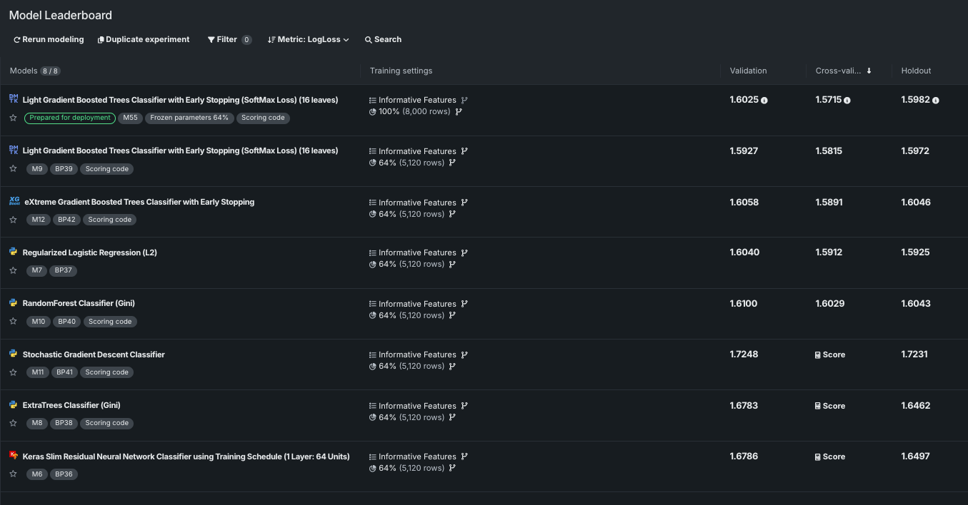 デフォルトでは、リーダーボードは展開された全幅表示で開き、エクスペリメント内のすべてのモデルとそのトレーニング設定の概要、および検定、交差検証、ホールドアウトの各スコアが表示されます。 バッジによって、モデルの識別とスコアリングに関する情報をすばやく確認でき、モデル名の前のアイコンはモデルタイプを示します。