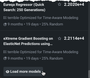 DataRobotは、リーダーボードを構築する際にモデルを入力し、最初は最大50のモデルを表示します。 追加のモデルをロードをクリックすると、クリックするたびに50のモデルが読み込まれます。