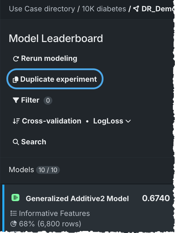 現在のエクスペリメントを複製するには、リーダーボードの上部にあるリンクを使用します。 これにより新しいエクスペリメントが作成され、データを再アップロードするよりも速くデータを操作できます。
