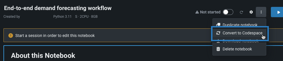 ノートブックインターフェイスのアクションメニューから、Codespaceに変換を選択します。 スタンドアロンのノートブックをcodespaceに変換できるのは、対象のノートブックが現在アクティブなセッションで実行されていない場合だけであることに注意してください。 変換を開始する前にセッションを終了します。