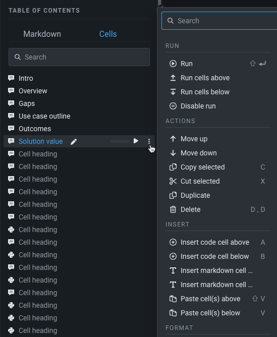 セルタブには、ノートブック内のすべてのセル(コードセルとマークダウンセルの両方)の概要が表示されます。 目次内のセルリストから セルアクションを実行(およびドラッグアンドドロップでセルを移動)できます。
