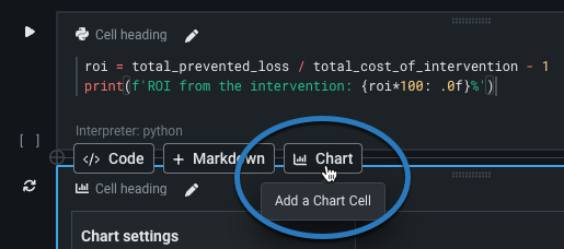 コードセルを追加するには、ノートブック内のセルの外側にカーソルを置き、チャートオプションを選択します。