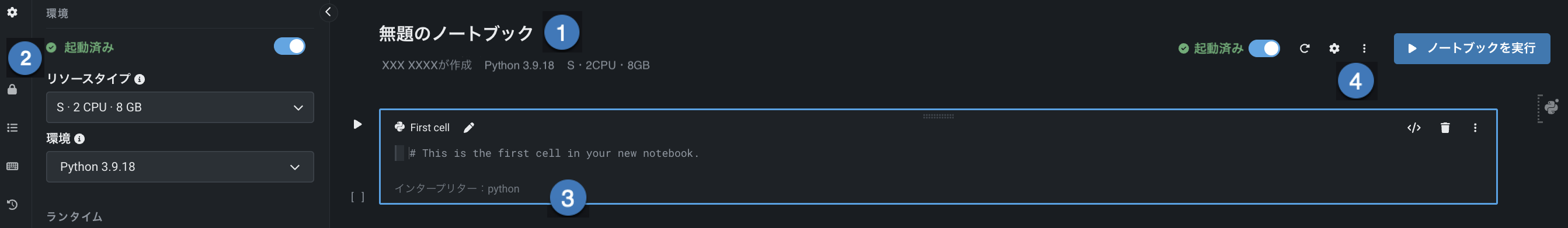 要素 説明 1 ノートブック名 ページの上部とダッシュボードに表示されるノートブックの名前です。 鉛筆アイコン をクリックして、その名前を変更します。 2 サイドバー ノートブック設定および追加のノートブック機能を設定するオプションをホストします。 3 セル ノートブックの本体であり、ここで完全な構文ハイライトを使用してコードの記述および編集をする(コードセル)か、またはここに説明テキストと手続きテキスト(マークダウンセル)が含まれます。 4 メニューバー ノートブック環境のステータス、表示オプション、ノートブック管理オプション、およびノートブックを実行するためのボタンを提供します。