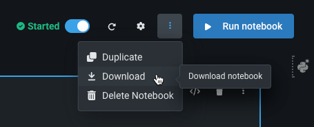 エクスポートするノートブックがある場合は、.ipynbファイルとしてダウンロードすることでエクスポートできます。 ノートブック内のアクションメニュー をクリックし、ダウンロードをクリックします。
