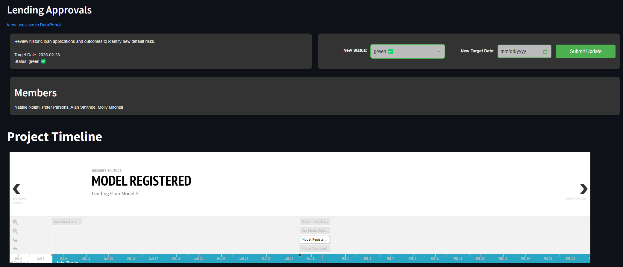DataRobot provides management capabilities for a variety of personas. Using data across Use Cases, experiments, the model registry, and deployments we are able to report on the full lifecycle of an AI project. This AI Accelerator provides a template for a project management dashboard that collects all the key artifacts in a Use Case and displays them on a timeline. It also allows project managers to define a target date and overall status for each Use Case.