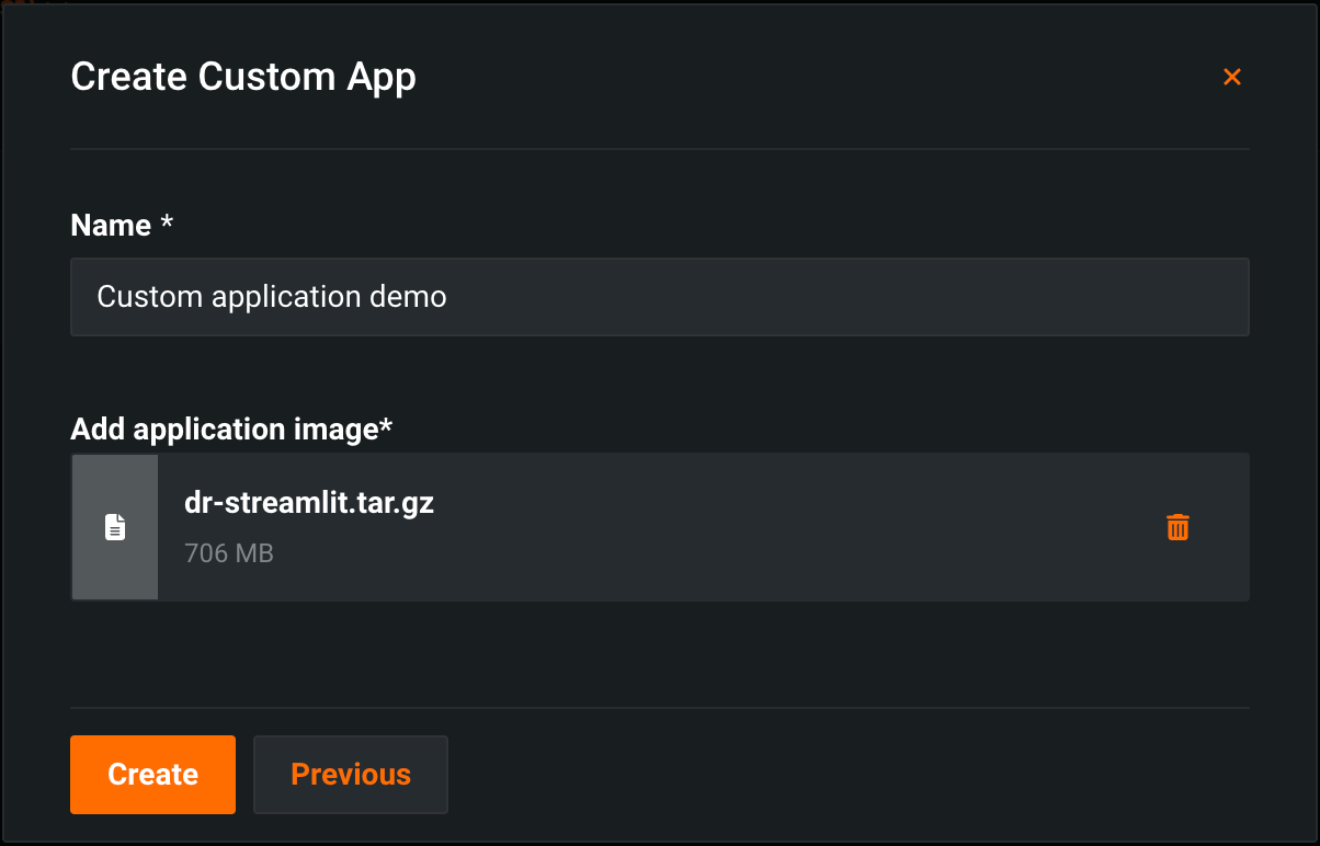 Once you have a custom application tar, gz, or tgz archive, you can upload the image to the Applications tab in DataRobot: