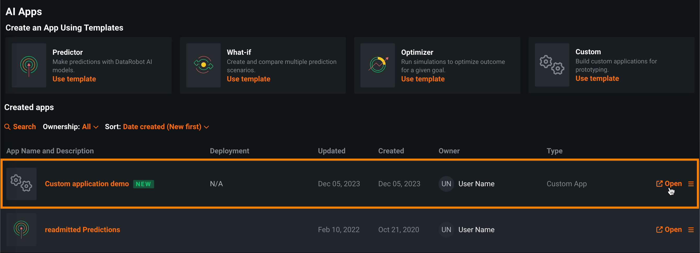 Create custom applications in DataRobot to share machine learning projects using web applications, including Streamlit and Dash, from an image created in Docker. Once you create a custom machine learning app in Docker, you can upload it as an app in DataRobot and deploy it with secure data access and controls. Alternatively, you can use the DRApps command line tool to create your app code and push it to DataRobot, building the image automatically.