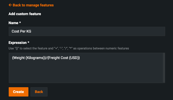 Name the custom feature, then type the function and features using the supported syntax. The example below measures the cost of shipments per kilogram.