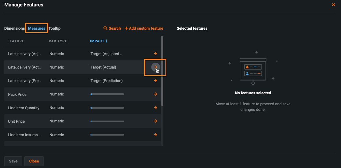 In the Dimensions tab, click the orange arrows next to one or more features you’d like to visualize on the x-axis. You can select categorical, date, and boolean features.