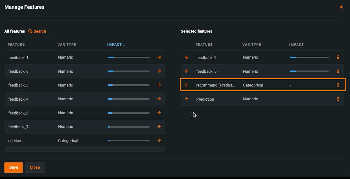 | Prediction Information | Displays feature values likely to impact the prediction, as well as Prediction Explanations. |