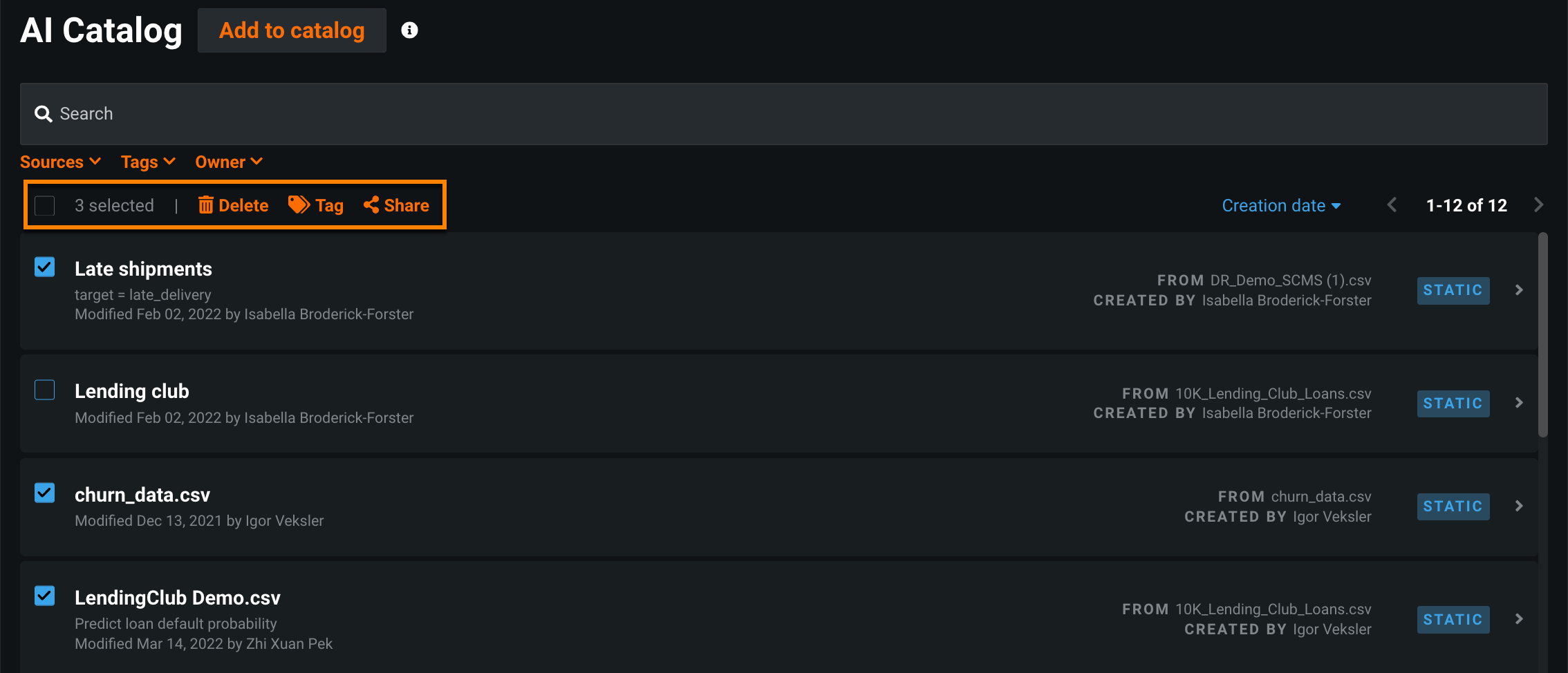 You can share, tag, or delete multiple datasets at once using the bulk action functionality in the AI Catalog. Start by selecting the box next to the asset(s) you want to manage; select at least one asset to enable the bulk actions at the top. A counter also displays how many assets are actively selected.