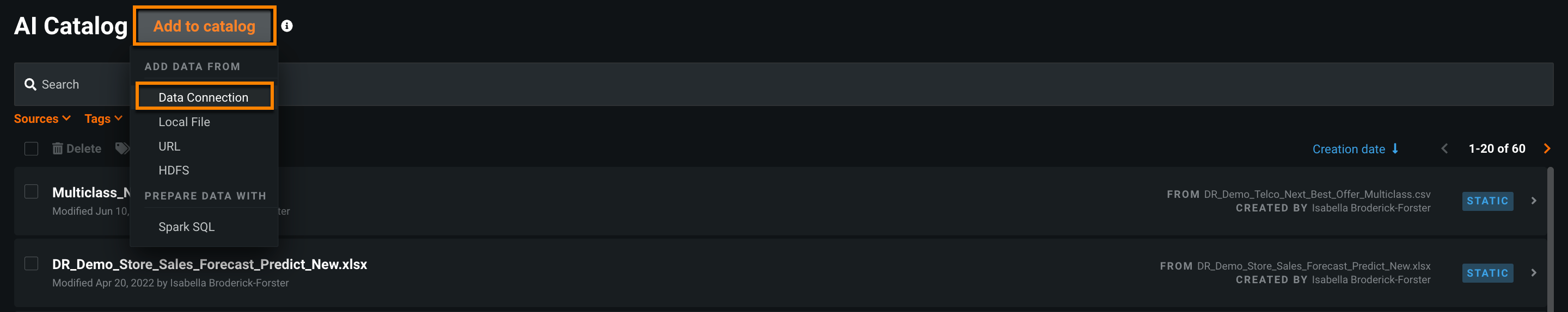 From the same Start screen or the AI Catalog, create data sources—from the data connections—to use for modeling and predictions.
